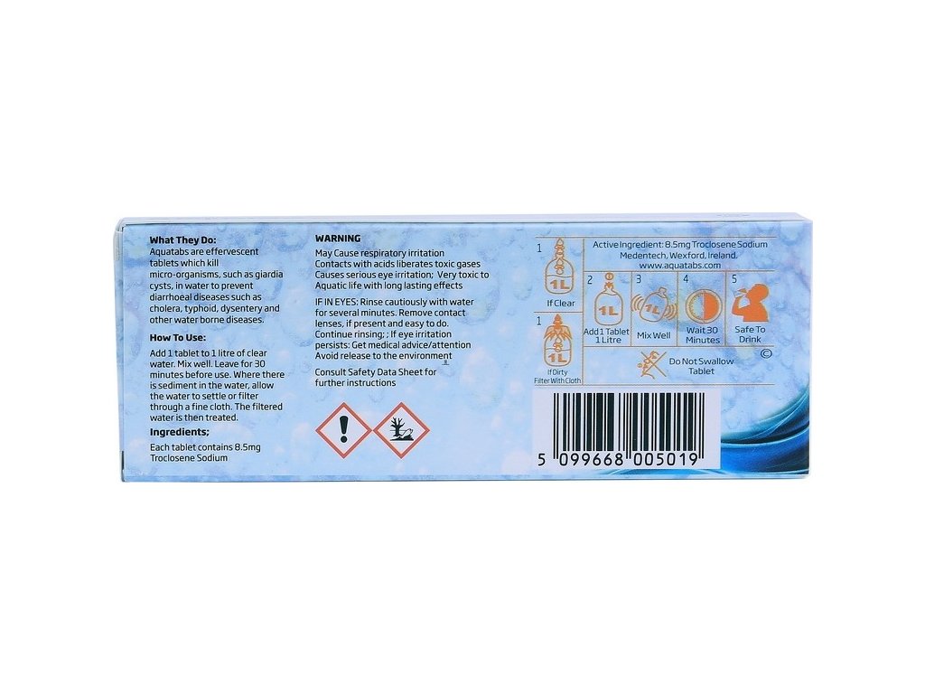 Aquatabs® sú účinné dezinfekčné tablety určené na čistenie pitnej vody. Rýchlo a spoľahlivo odstraňujú baktérie a patogény, čím zaisťujú bezpečnú konzumáciu vody v teréne, na cestách alebo v núdzových situáciách.