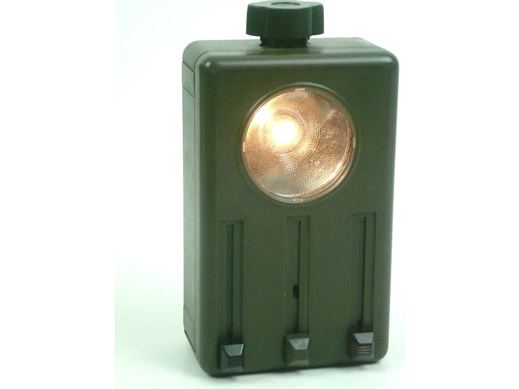 - Vojenské, trojfarebné svietidlo s plastovou konštrukciou.