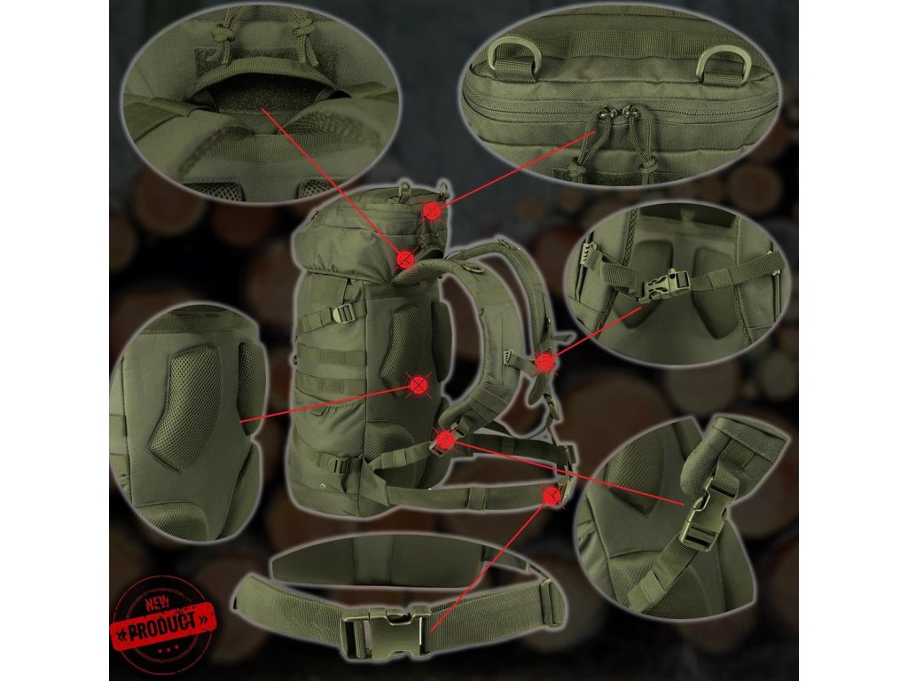 - Početné montážne pásky / univerzálna väzba systému Molle umožňujú rozšíriť batoh.