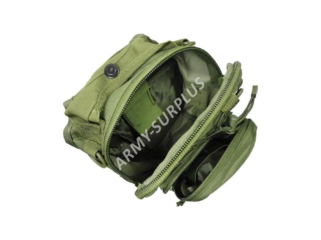- hlavné vrecko sa zapína na dvojcestný zips aa má 2 priehradky, v jednej priehradke je na suchom zipse pripnutý panel s vreckom na malú pištoľ alebo revolver