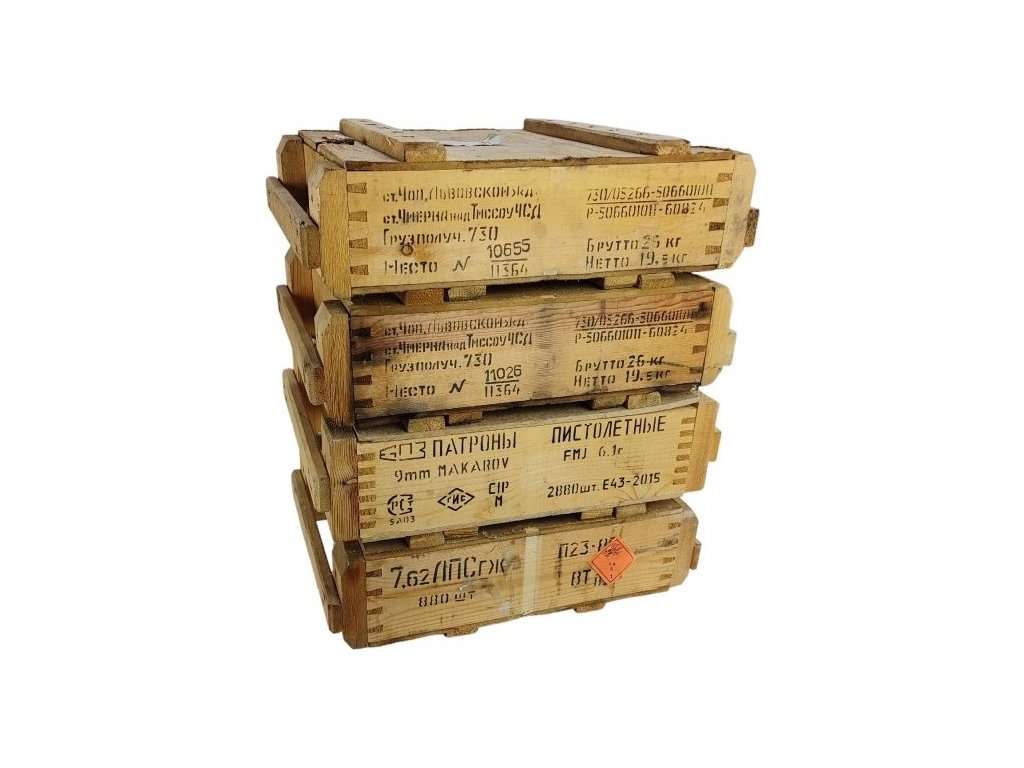 - Robustná drevená debna od nábojov 7,62 mm, alebo 9 mm Makarov.