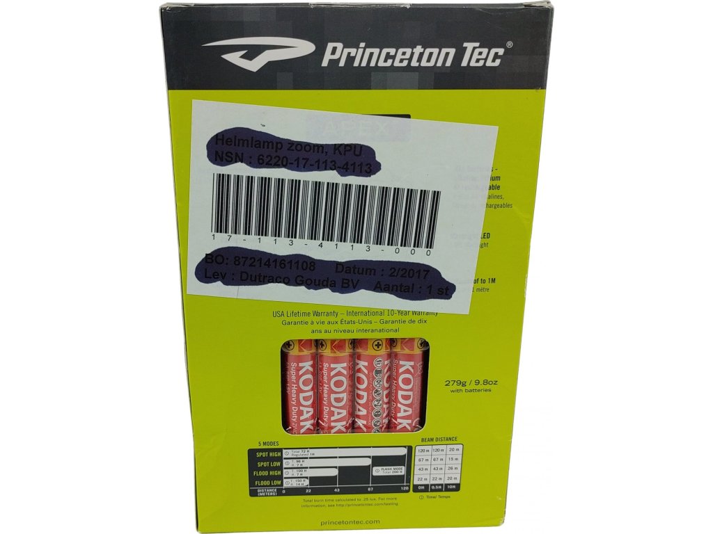Profesionálne taktické svietidlo amerického výrobcu svetoznámej značky Princeton Tec® model APEX™, s triedou vodeodolnosti IPX7, odolávajúci krátkodobému ponoreniu do hĺbky 1 metra. Holandský vojenský model čelového svietidla v olivovo zelenom prevedení Olive Drab, pochádzajúci z oficiálnej výstroje ozbrojených pozemných síl Kráľovskej armády Holandska (Holandska).