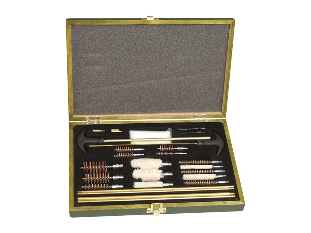 Univerzálna čistiaca sada na zbrane značky Mil-Tec v drevenej krabici. Sada je určená na čistenie pištolí i pušiek a ďalších dlhých zbraní. Obsahuje rôzne nástavce, predlžovacie tyčky, mosadzné drôtené kefy, vlnené stierače, mosadzné závitové adaptéry a plastové držiaky knôtov.