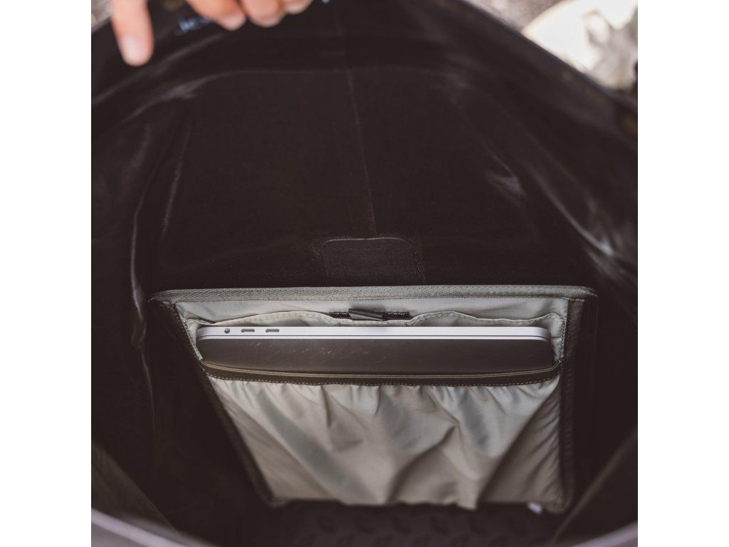 Taška z nepremokavého materiálu s rolovacím zapínaním (roll top), ktoré účinne bránia vniknutiu vody dovnútra.