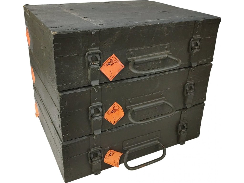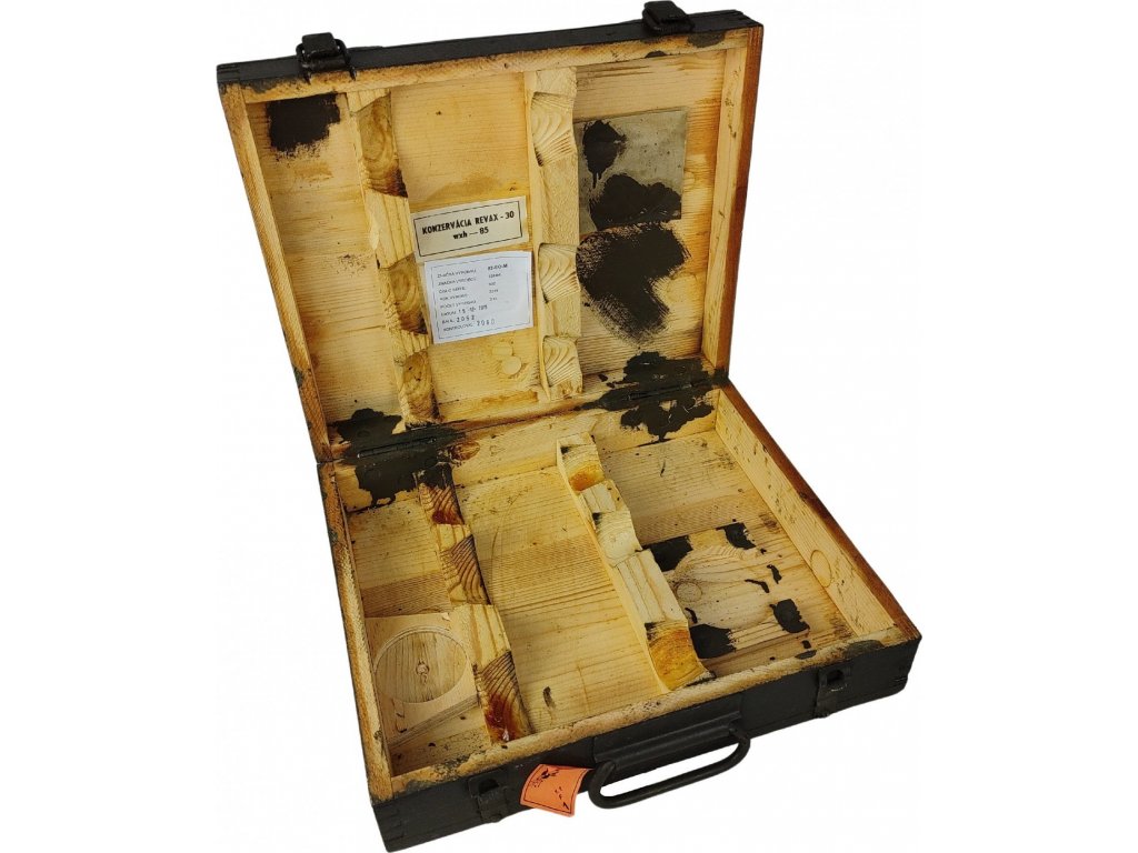 - robustná kufríková drevená debna na uloženie 3 kusov delostreleckej míny 82 mm pre mínomet M 52 (82-EO-M 52)