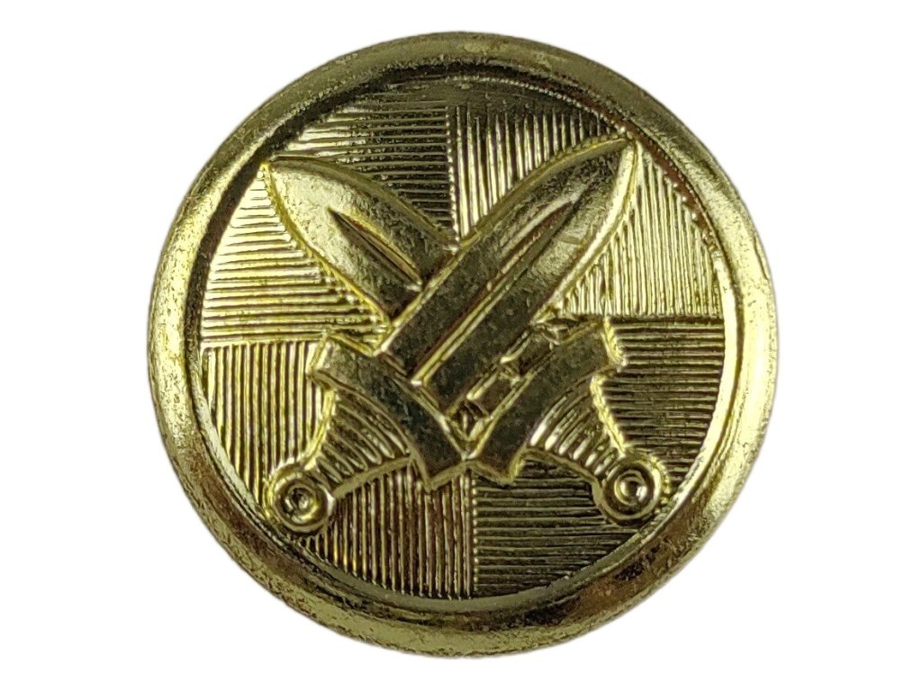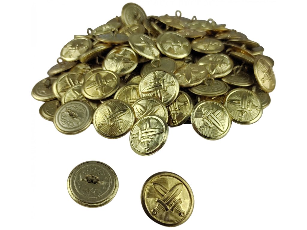 - Elegantný kovový gombík zdobený armádnym symbolom dvoch skrížených mečov.