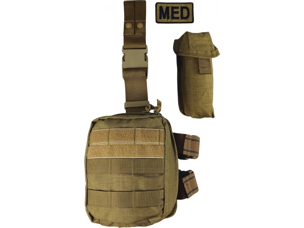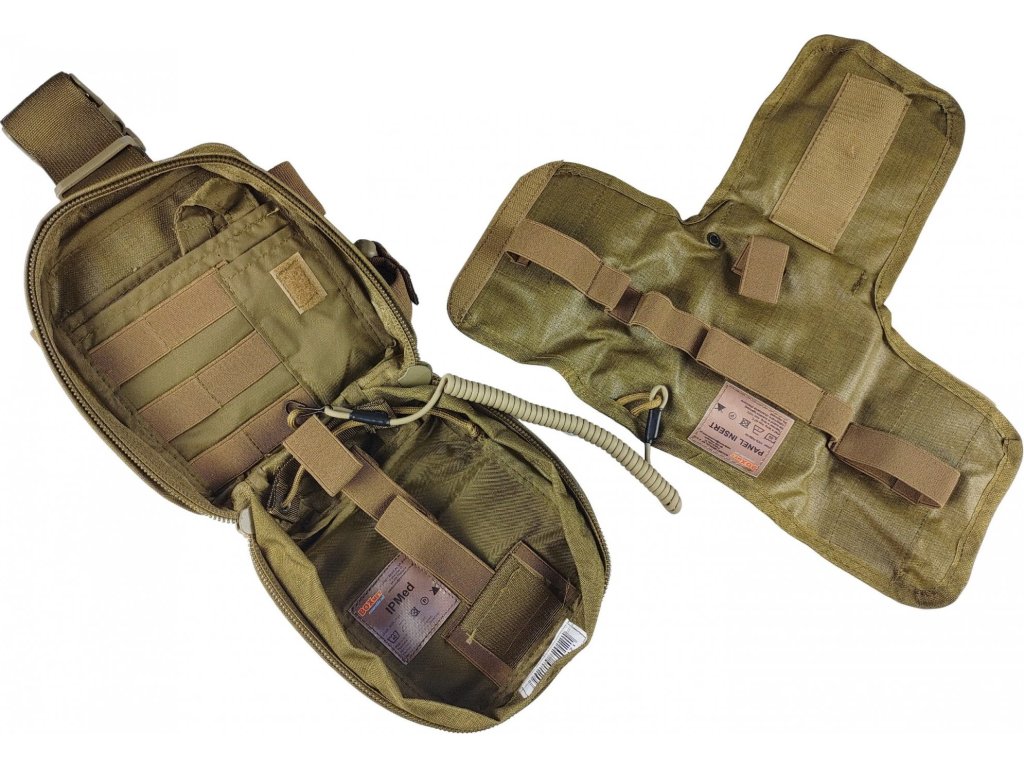 Obsah sady: zdravotné puzdro IFAK, menšie puzdro MOLLE, stehenný panel