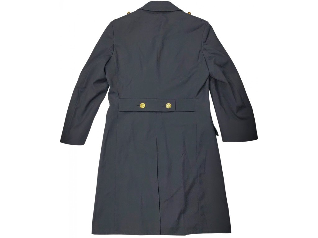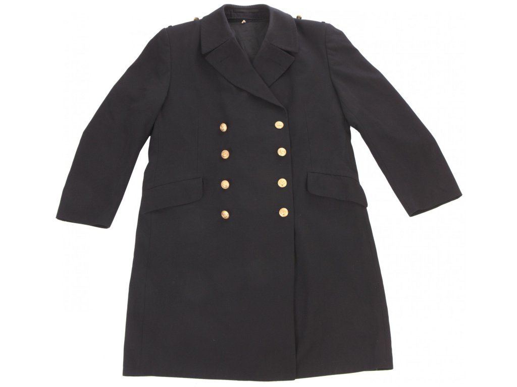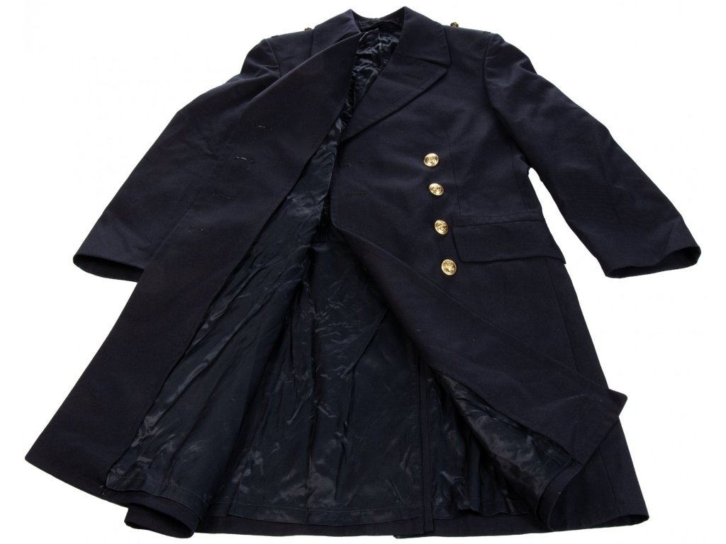 - Zapínanie v prednej časti po celej dĺžke kabáta dvojitým radom zlatistých gombíkov, ktoré sú zdobené námornou kotvou.