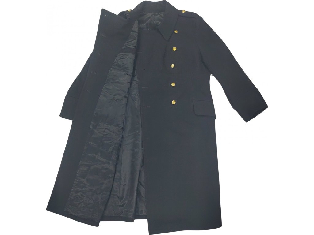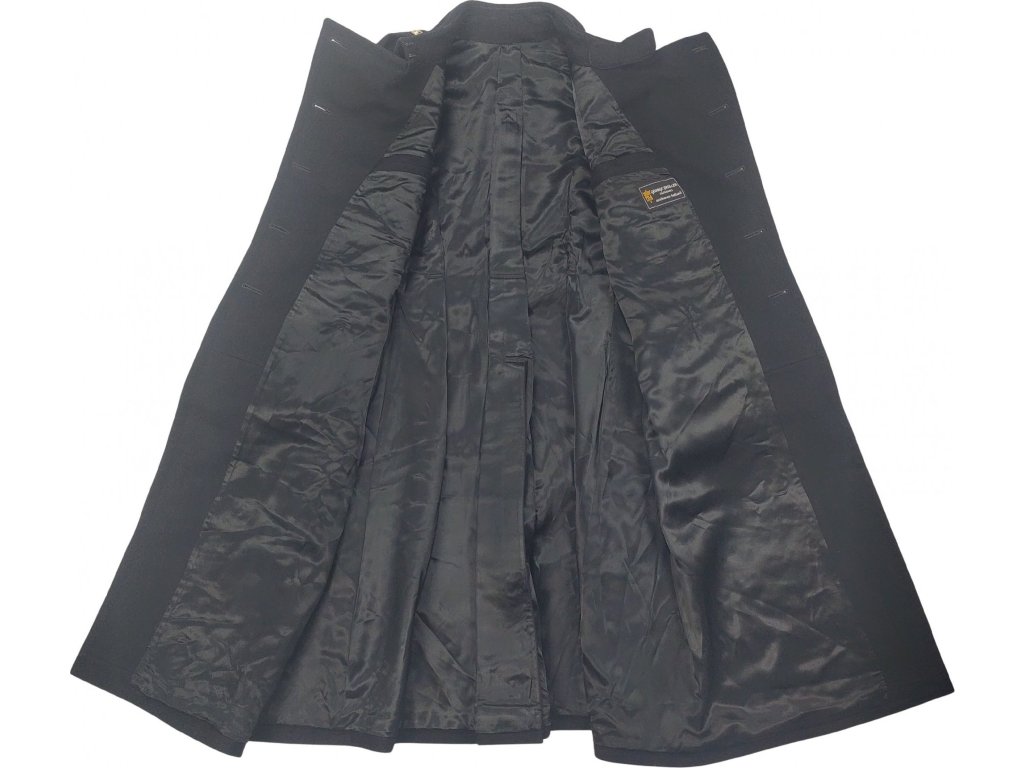 Originálny vlnený dlhý zimný kabát námornej flotily pre dôstojníkov Kráľovského námorníctva Holandska/Holandska. S vnútornou hladkou podšívkou as dvojradovým zapínaním na zdobené zlatisté gombíky. Vysoký golier s chráničom. Tmavo čierna farba. Kabáty sú použité ale v celkovo dobrom a zachovalom stave, ide o vyradené vojenské vybavenie z prebytkov Holandskej armády. Každý kus bol vyrobený koncom 50. rokov av priebehu 60. rokov ručne na mieru a neobsahuje tak bežné veľkostné označenie (viď. nami meraná tabuľka veľkostí).