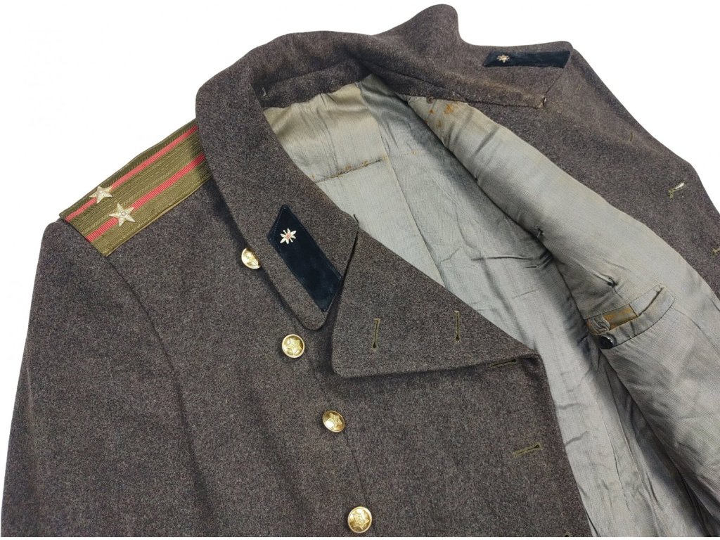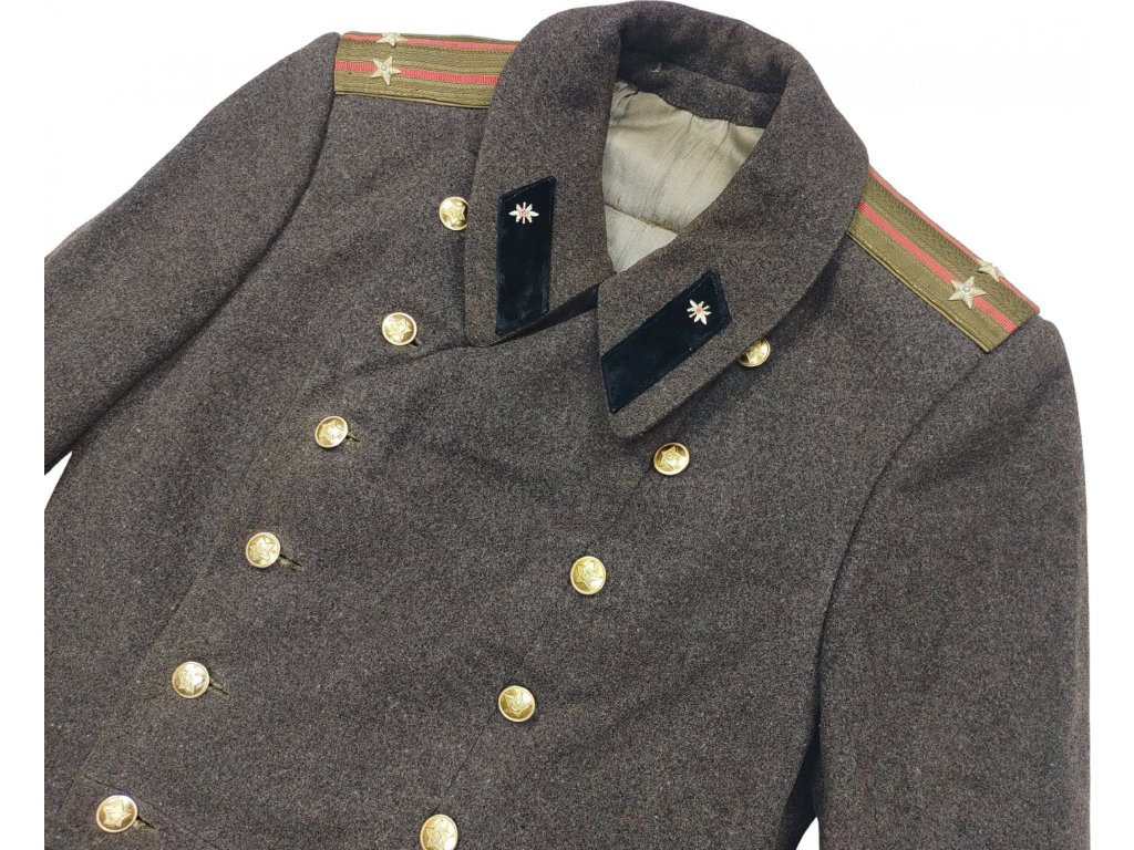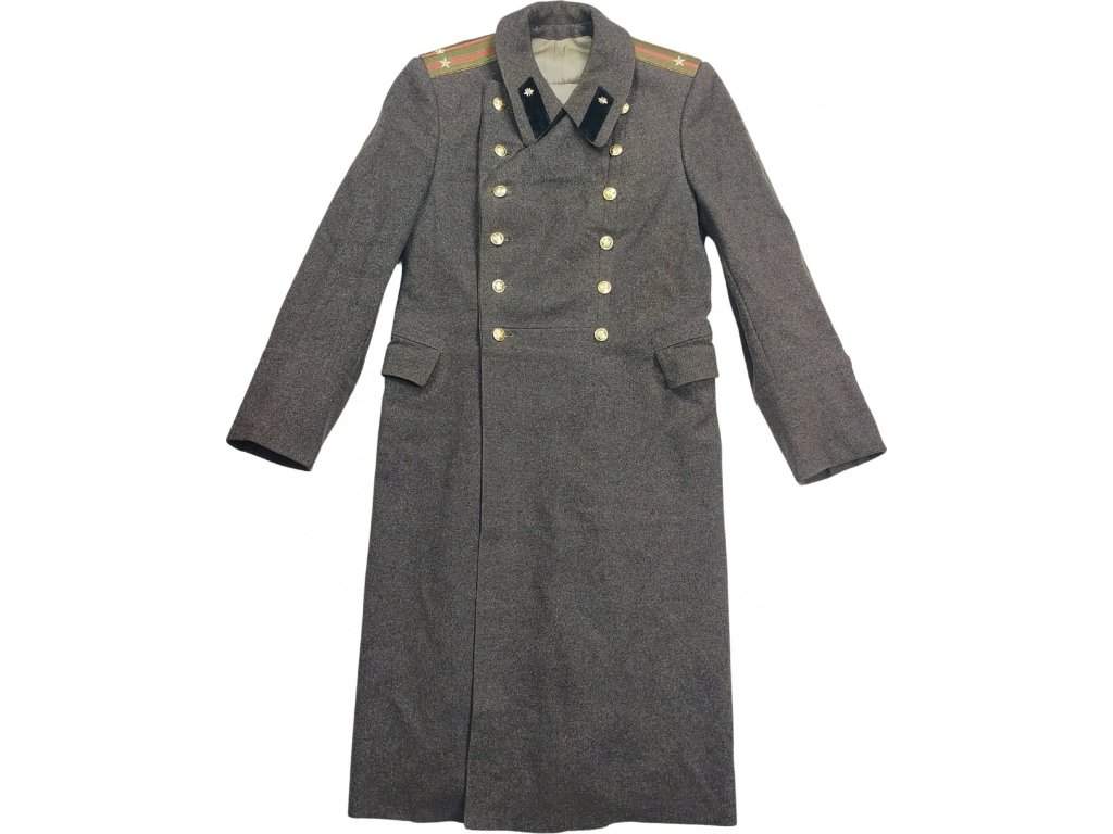 Kabát vyššieho dôstojníka sovietskej armády v hodnosti majora spojárskeho vojska, vyrobený z poctivej a hutnej 100% vlny tmavo šedej farby. Dvojradové zapínanie na zlatisté gombíky, ktoré sú typicky zdobené päťcípou hviezdou s kladivom a kosákom.