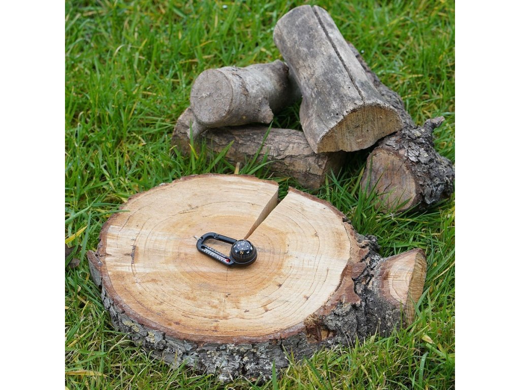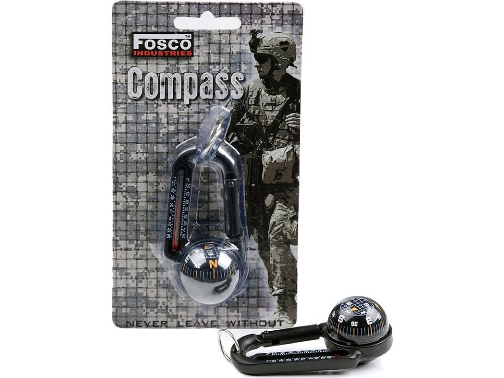 Karabína s kompasom a teplomerom Fosco Industries slúži na navigáciu a meranie teploty počas outdoorových aktivít, ako je turistika alebo kempovanie.