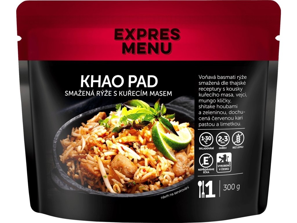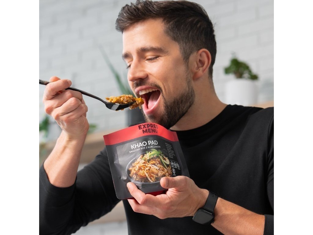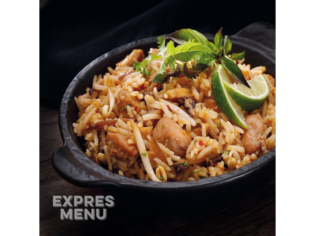 Khao Pad od EXPRES MENU je tradičné thajské jedlo v podobe vyprážanej ryže s kuracím mäsom. Vyvážená kombinácia ryže, šťavnatého kuracieho mäsa a jemne korenené zmesi vytvára chutné a rýchle hotové jedlo pripravené na okamžitú konzumáciu po ohreve.