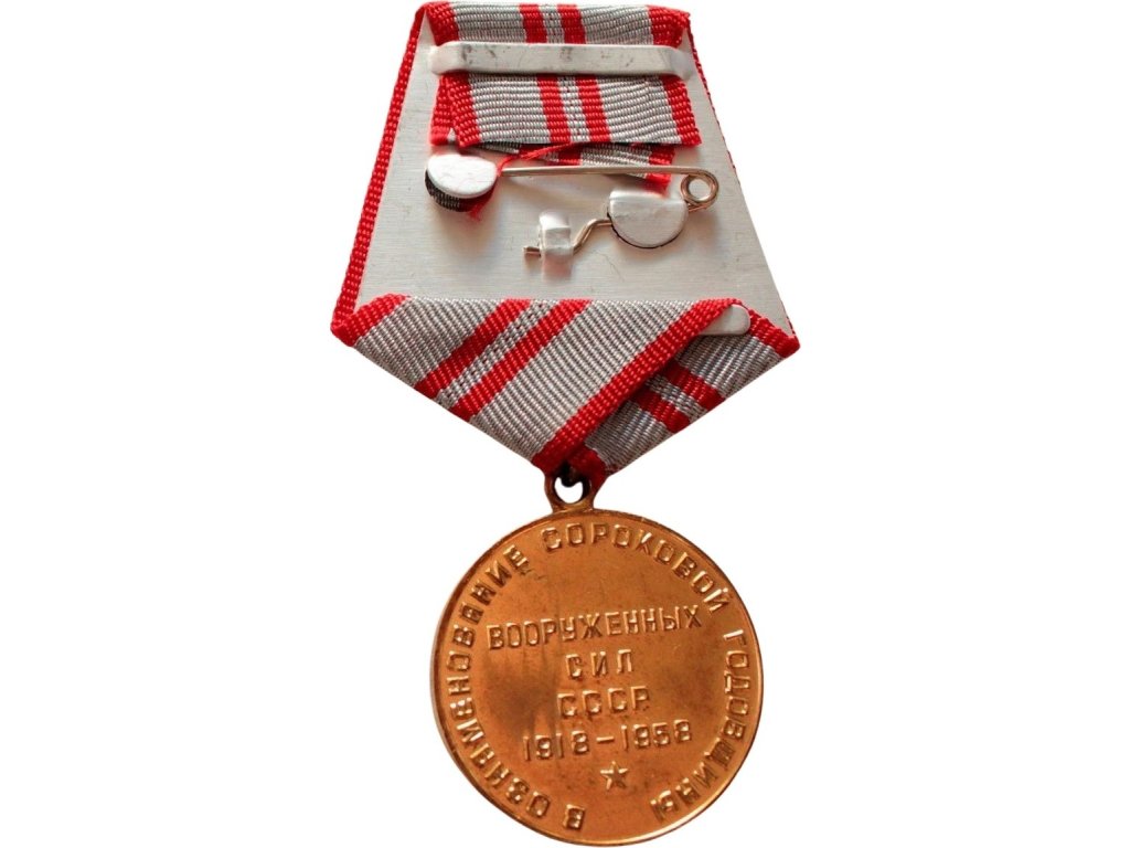 Zadná strana: Nápis „У ОЗНАМЕНОВАНИЕ СОРОКОВОЙ ГОДОВЩИНЫ“ (na oslavu štyridsiateho výročia), „VZŠIROVENÝCH СИЛ СССР“ (Ozbrojených síl ZSSR), letopočty 1918 – 1958 a malá päťcípa hviezda.