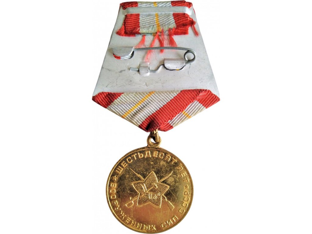 Na zadnej strane medaily sú po obvode nápisy: „Šesťdesiat rokov“ a „Ozbrojené sily ZSSR“, oddelené hviezdičkami. Uprostred - predstava päťcípej hviezdy s kladivom a pluhom uprostred, položená na skríženú pušku a šabľu.