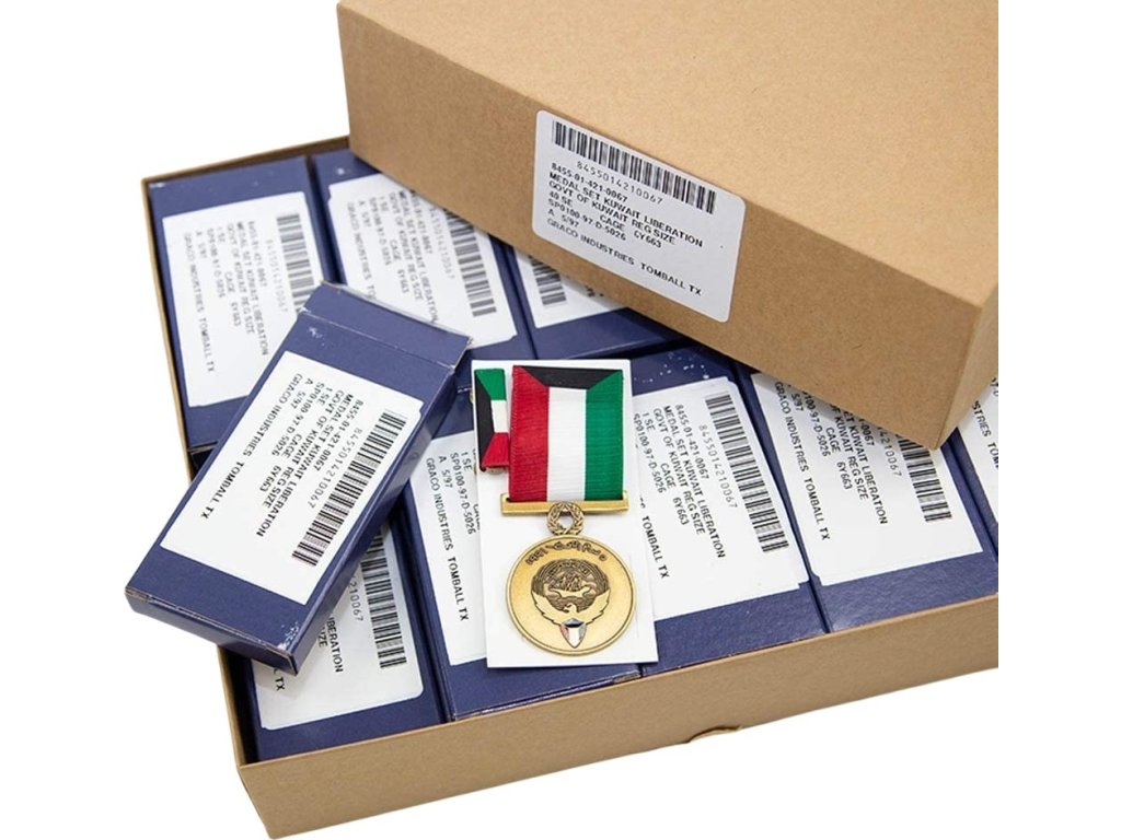 Stuha: Stuha je vzorom vlajky štátu Kuvajt a skladá sa z troch rovnakých pruhov 29/64 palca (11,5 mm), každý z nasledujúcich farieb: Old Glory Red 67156; Biela 67101; a Irish Green 67189. Čierny lichobežník je v hornej časti prikrývky a služobné stuhy.