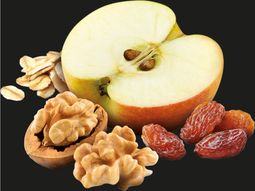 - jablká (35 %), voda, ovsené vločky (10 %), vlašské orechy (7 %), hrozienka (5 %) (hrozienka, slnečnicový olej), škorica, soľ.