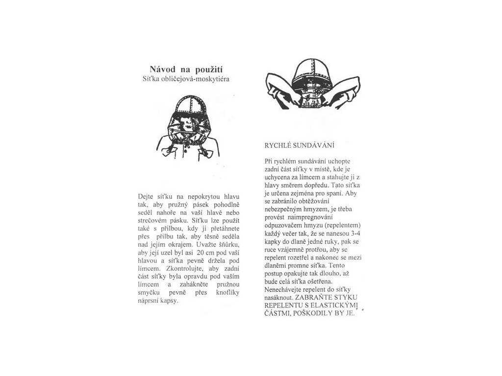 - Protihmyzová sieťka na ochranu hlavy užívateľa.