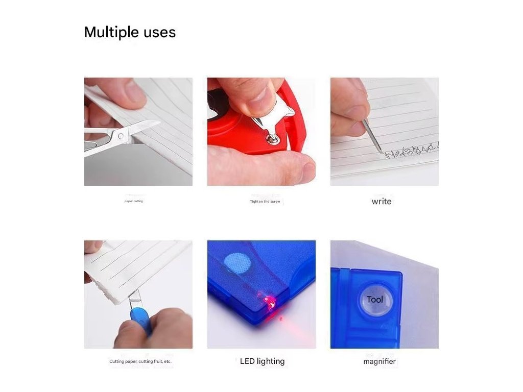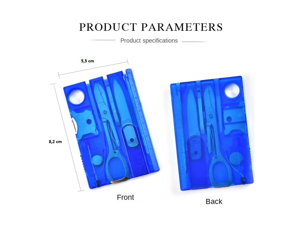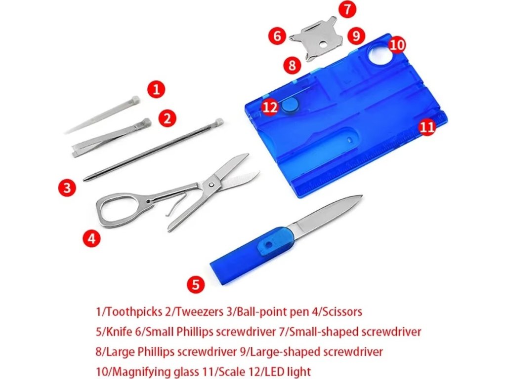Multifunkčná karta na prežitie modrá 12v1 Eurobatt® MultiTool Card. Vynikajúci pomocník pre každú príležitosť. Vzhľadom k malej veľkosti a nízkej hmotnosti vhodný pre každodenné nosenie, napríklad v peňaženke alebo ako prívesok na kľúče. Napriek tomu, že je karta s nástrojmi vytvorená v rozmeroch kreditnej karty, spája v sebe niekoľko užitočných funkcií. Perfektný na turistiku a cestovanie. Inšpirovaná osvedčenou kartou švajčiarskeho výrobcu VICTORINOX Swiss Card. Certifikovaný produkt poľskej značky Eurobatt®.