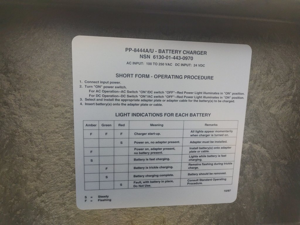 Jedná sa o poľnú nabíjačku batérií PP-8444A/U od spoločnosti Bren-Tronics. Je prenosná a dodáva sa vo vodeodolnom plastovom kufríku. Napájanie je možné striedavým prúdom (100–250 VAC) alebo jednosmerným prúdom (24 VDC). Nabíja batérie typu NiMH, NiCD a LiPol. Plné nabitie batérií NiMH a NiCAD trvá približne dve hodiny.