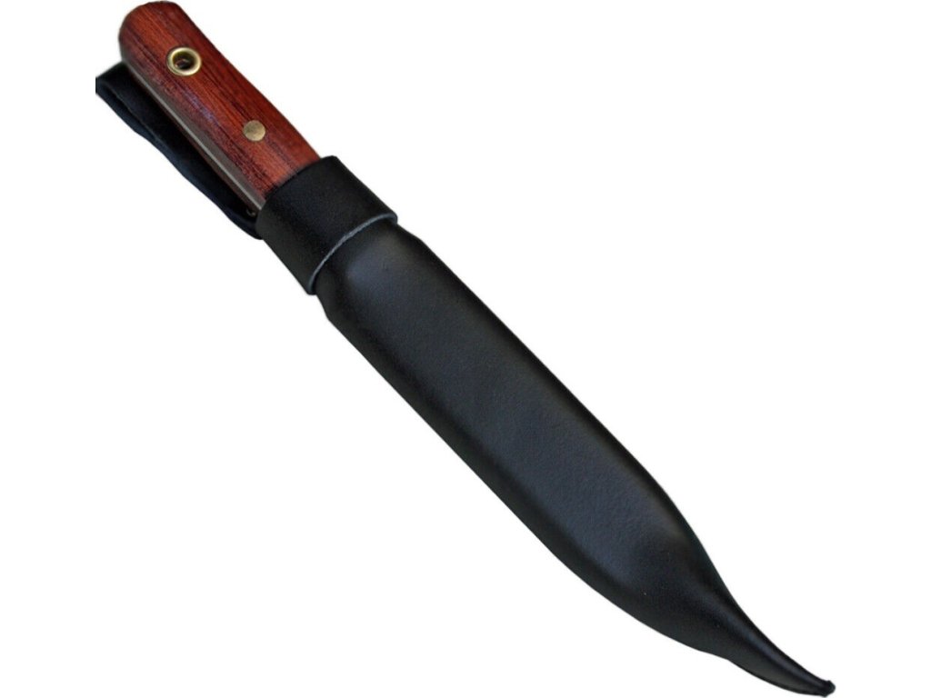 Kvalitná reprodukcia arašutistického noža s pevnou masívnou čepeľou, drevenou rukoväťou a pošvou z pravej kože podľa armádneho modelu nemeckého Bundeswehru.
