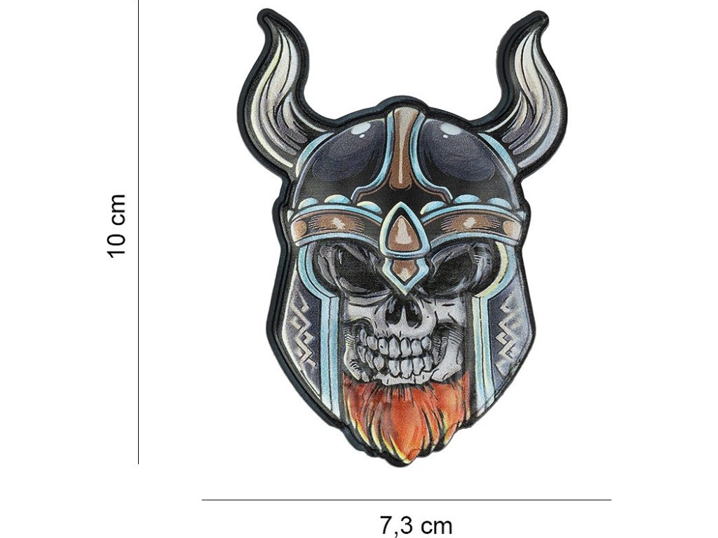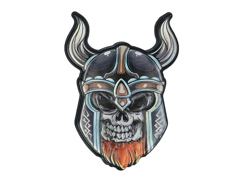 Plastová (PVC) nášivka zobrazuje štylizovanú lebku vikinga s rohmi.