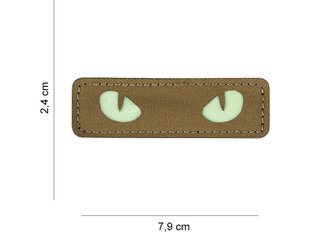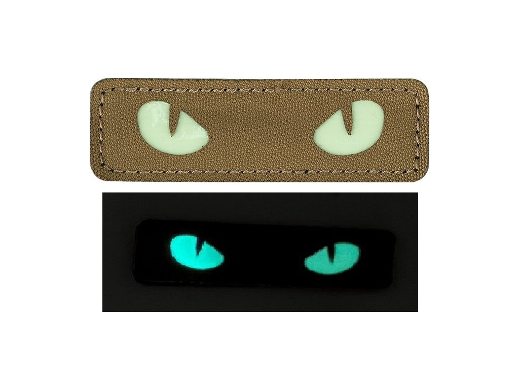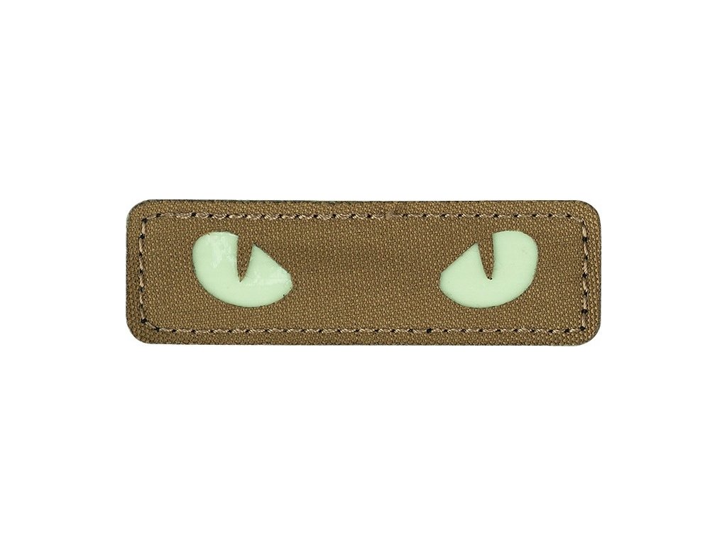 - Materiál a dizajn: Nášivka je vyrezávaná modernou laserovou technológiou, s motívom mačacích očí v bielej farbe na hnedom podklade farby Coyote. Biele časti sú luminiscenčné a svietia v tme.
