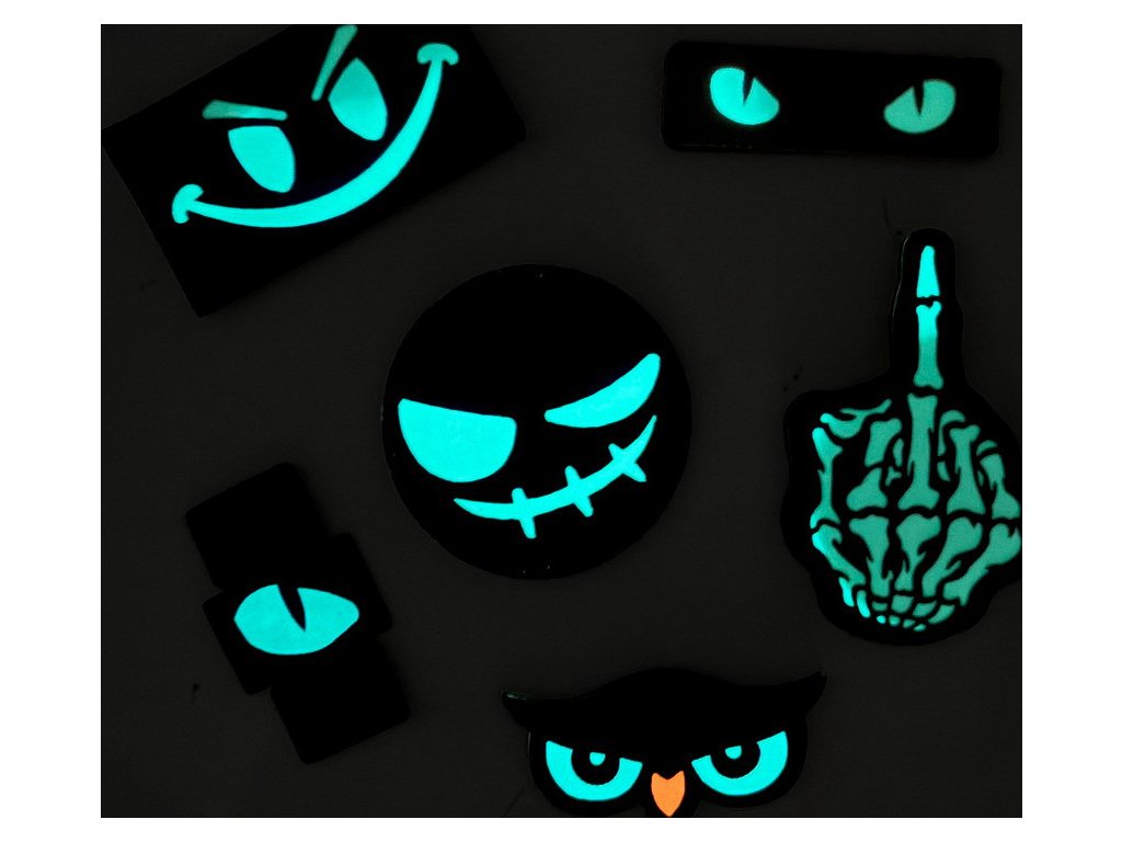 - Materiál a dizajn: Nášivka je vyrezávaná modernou laserovou technológiou, s motívom mačacích očí v bielej farbe na čiernom podklade. Biele časti sú luminiscenčné a svietia v tme.