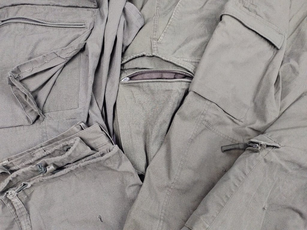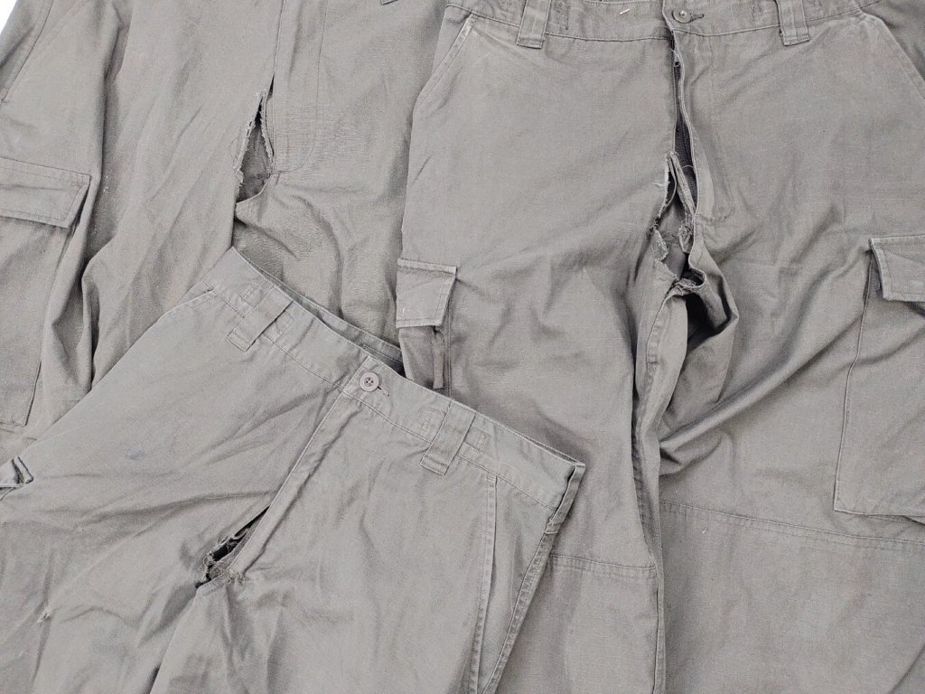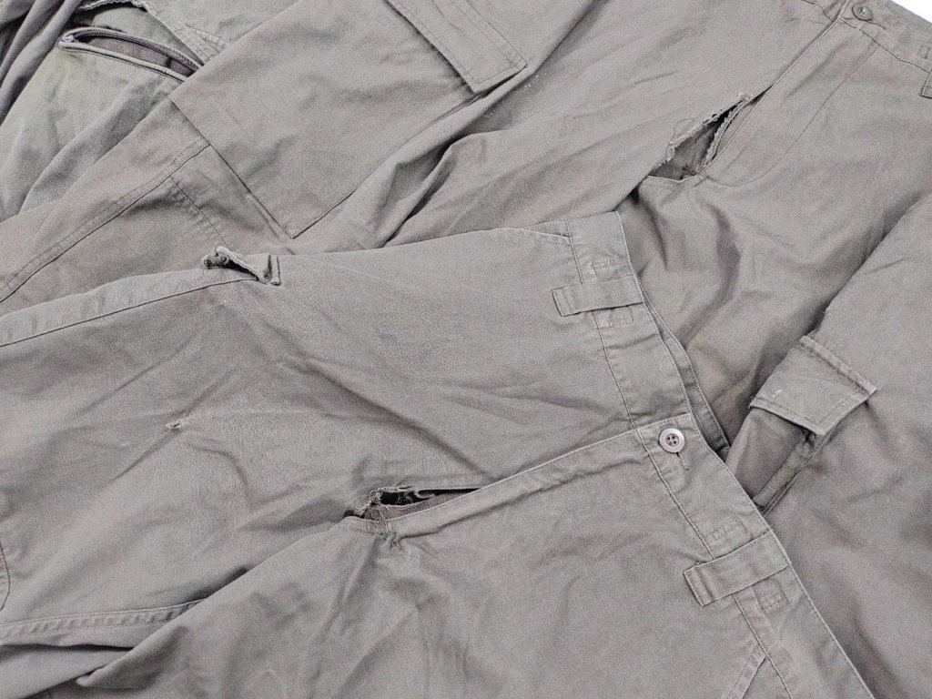 - Použitý tovar II. akosti (nohavice nesú stopy užívania, majú rôzne poškodenie - určené na opravu , prevažne ich možno ich s trochou snahy opraviť klasickým zašitím: poškodené sú prevažne vedľa zipsu rázporku, niektoré kusy majú prepálené dierky na nohaviciach, z časti odparené vrecká a zipsové vrecká ako chýbajúce jazdy. manžiet nohavíc, vyberané náhodne v postupnom poradí od "najlepšieho" možného stavu).