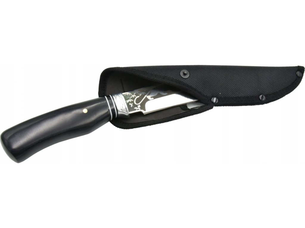 Tento veľký poľovný nôž má úhľadnú kónickú čepeľ 440C, nabrúsenú do ostrej hrany. Rukoväť je vyrobená z masívneho dreva s kovovým zdobením. Kovový chránič prsta je do detailu prepracovaný. Skvele vyzerajúci nôž do každej zbierky.