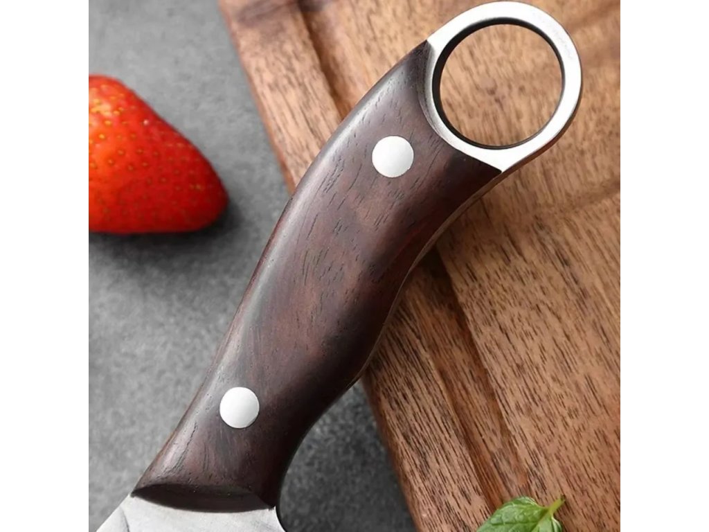 Rukoväť je vyrobená z tmavého dreva a má dva svetlé nity, ktoré ju upevňujú k čepeli. Na konci rukoväte je výrazný kovový prstenec pre lepšiu manipuláciu alebo zavesenie.
