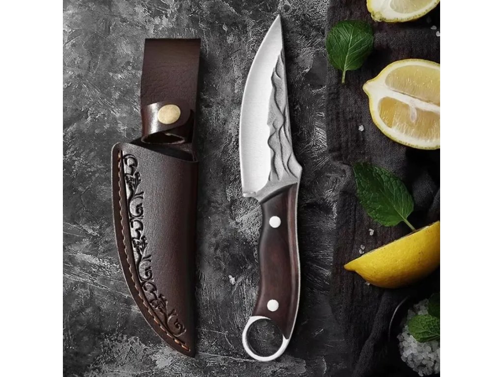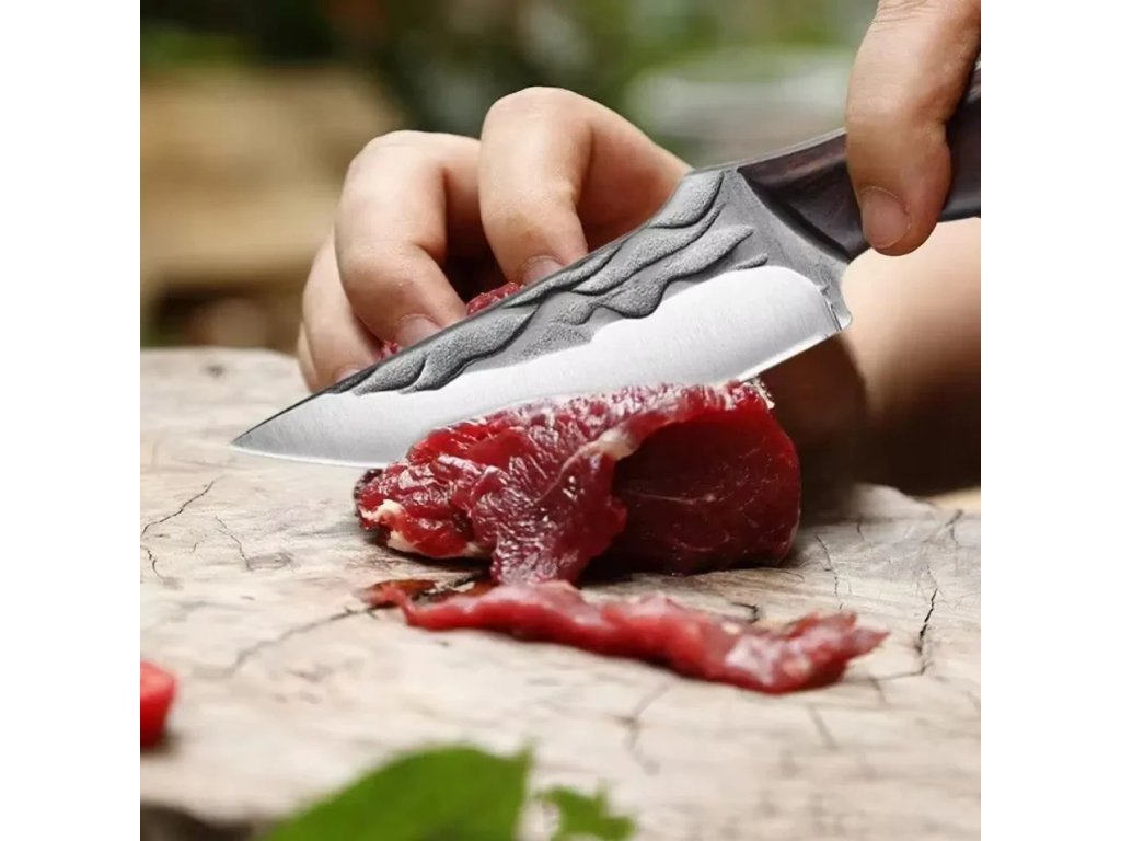 Čepeľ je vyrobená z vysoko kvalitnej nerezovej ocele a má charakteristický, ručne kovaný vzhľad s textúrou, vďaka tomu je odolná a má krásny vzhľad.
