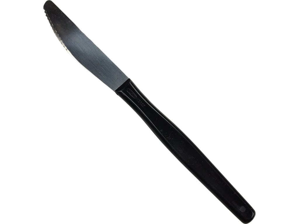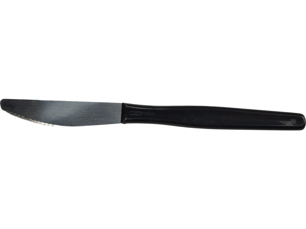 - Jedálenský nerezový nôž s ostrým ozubením a čiernou rukoväťou z plastu.