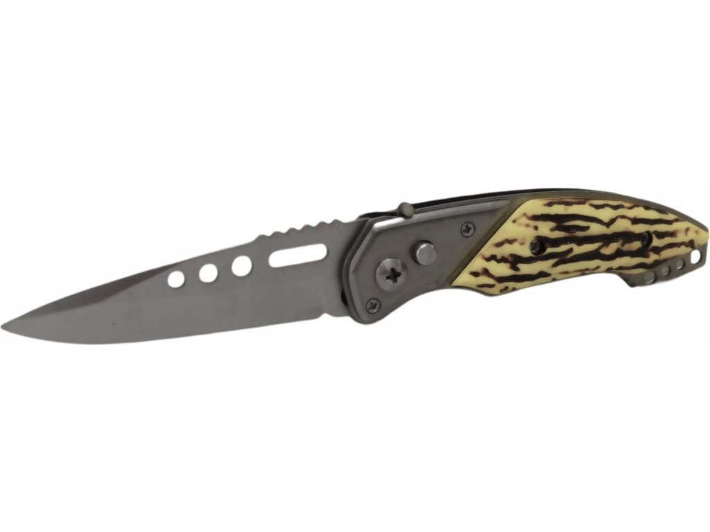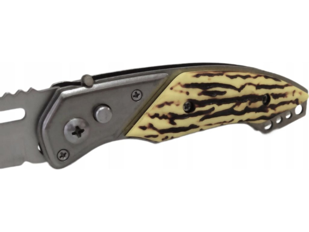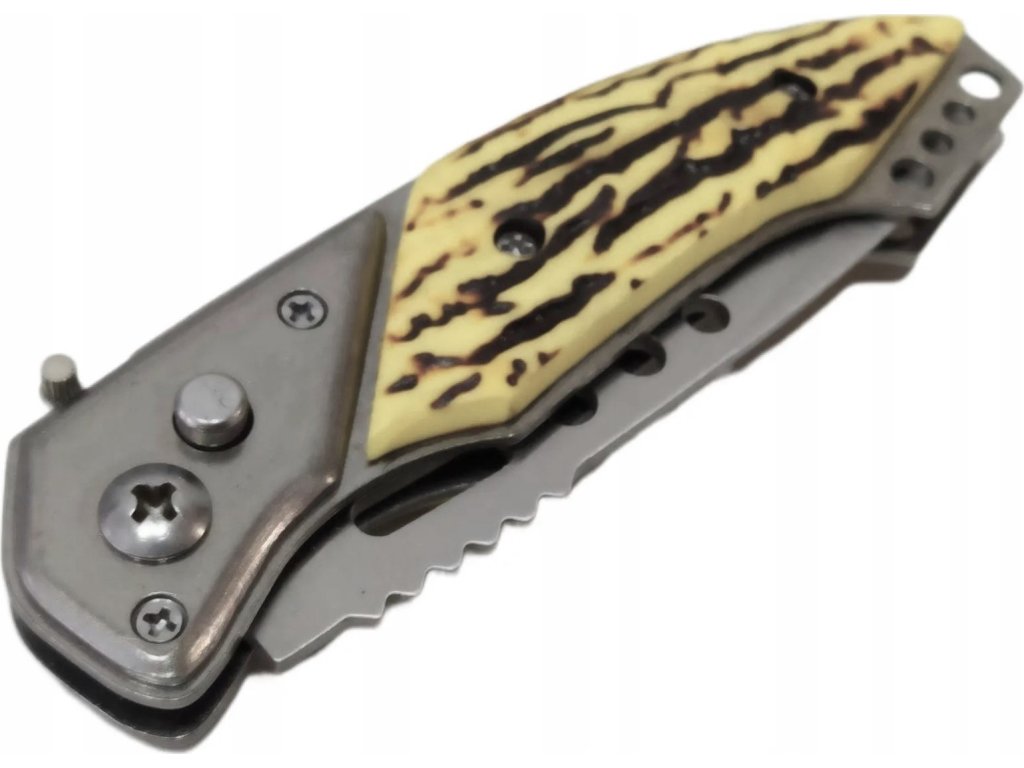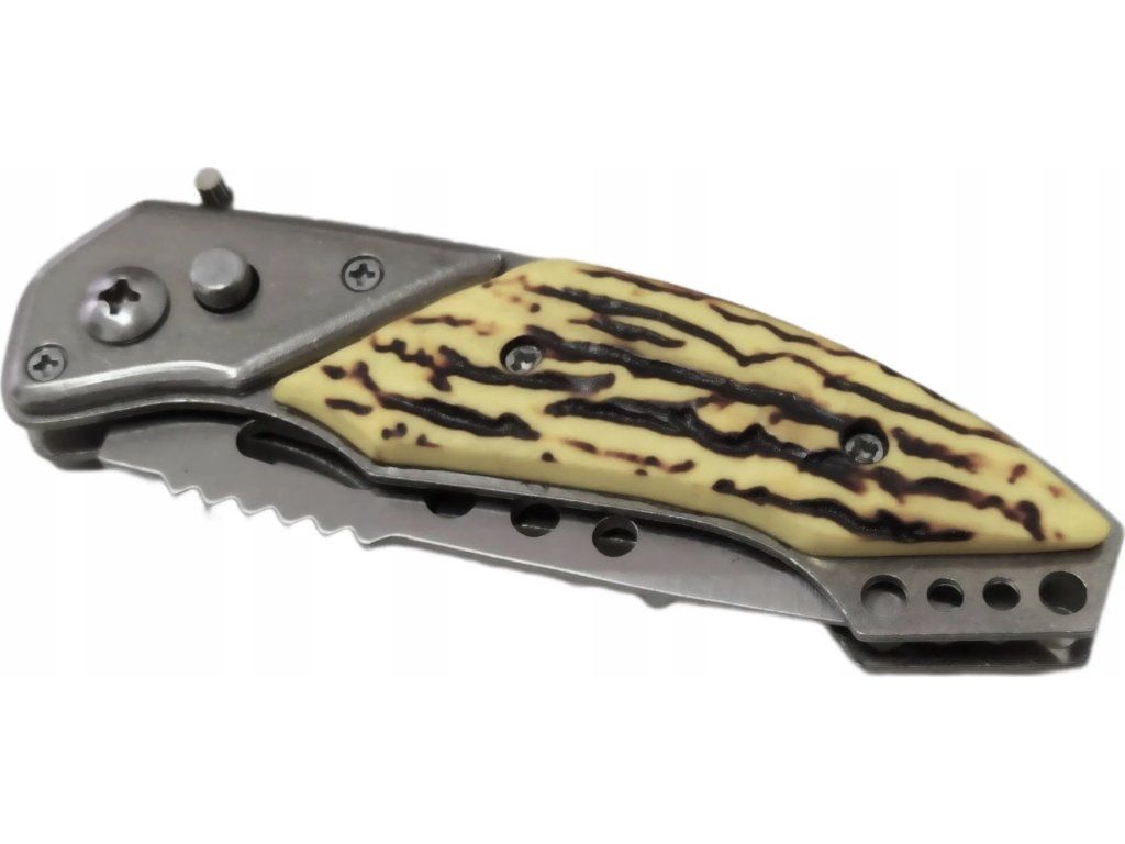 - Vreckový vystreľovací (automatický / pružinový) nôž s rukoväťou imitácie jelenia kosti, zhotovené zo živice.