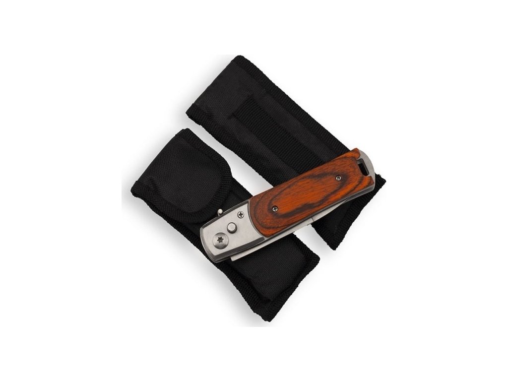 - Pocket knife 20,6 cm, automatické, s wooden handle, s bielym holster.