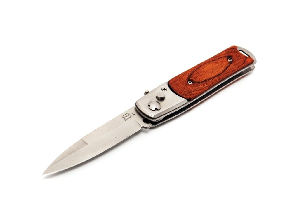 - Vreckový vystreľovací (automatický / pružinový) nôž s drevenou rukoväťou.
