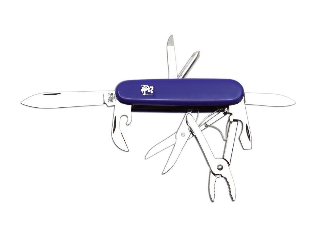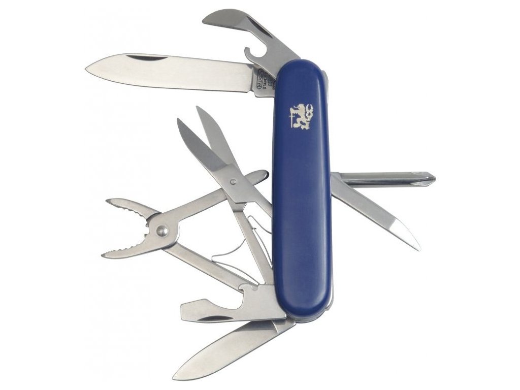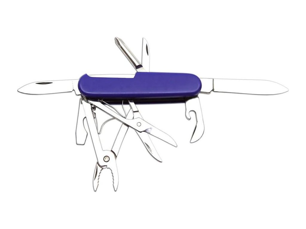 - čepeľ, malá čepeľ, otvárač na fľaše/skrutkovač/drážka na odizolovanie vodičov, otvárač na konzervy, nožnice, kliešte, krížový skrutkovač, bodec