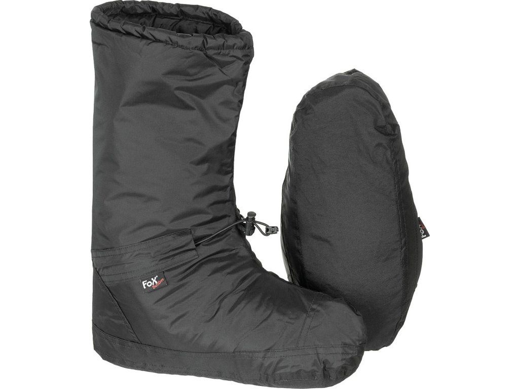 Zateplené návleky na nohy. Použiteľné v spacom vaku či ako topánky do stanu/chatky. Tieto topánky skvele izolujú a sú veľmi hrejivé pre ideálny tepelný komfort pokiaľ čas trávite vonku. Stlačiteľné a ľahké pre úsporu cenného miesta a hmotnosti. Disponujú elastickým sťahovaním s plastovou brzdou v oblasti členkov. Univerzálna veľkosť padnúcej väčšine. S praktickou tranšportnou taškou so sťahovacou šnúrkou. Vyrobené z prvotriednych materiálov odolných vetru, vlhkosti a vode. Kvalitný produkt nemeckej outdoorovej značky FoX® Outdoor.