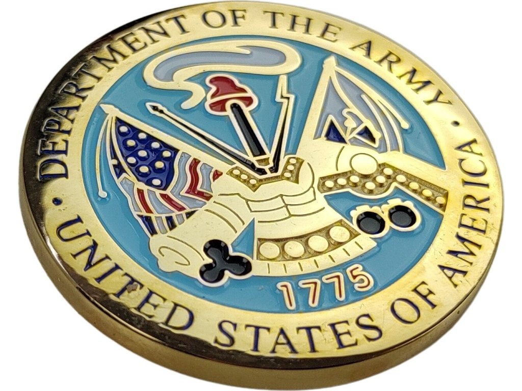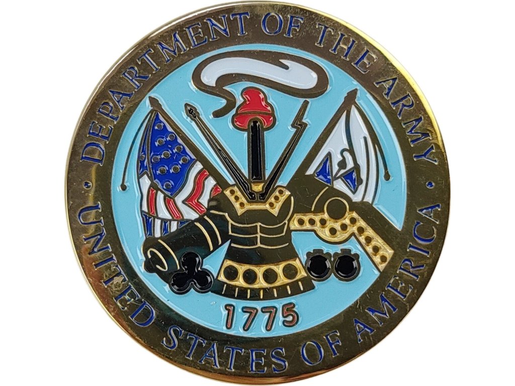 - Predná strana (ľavá minca na obrázku):Zobrazuje pečať Ministerstva armády Spojených štátov (Department of the Army), s nápisom „UNITED STATES OF AMERICA 1775“. Pečať obsahuje rímsku zbroj, delovú hlaveň, prápor s hviezdami a ďalšie symboly spojené s americkou armádou.