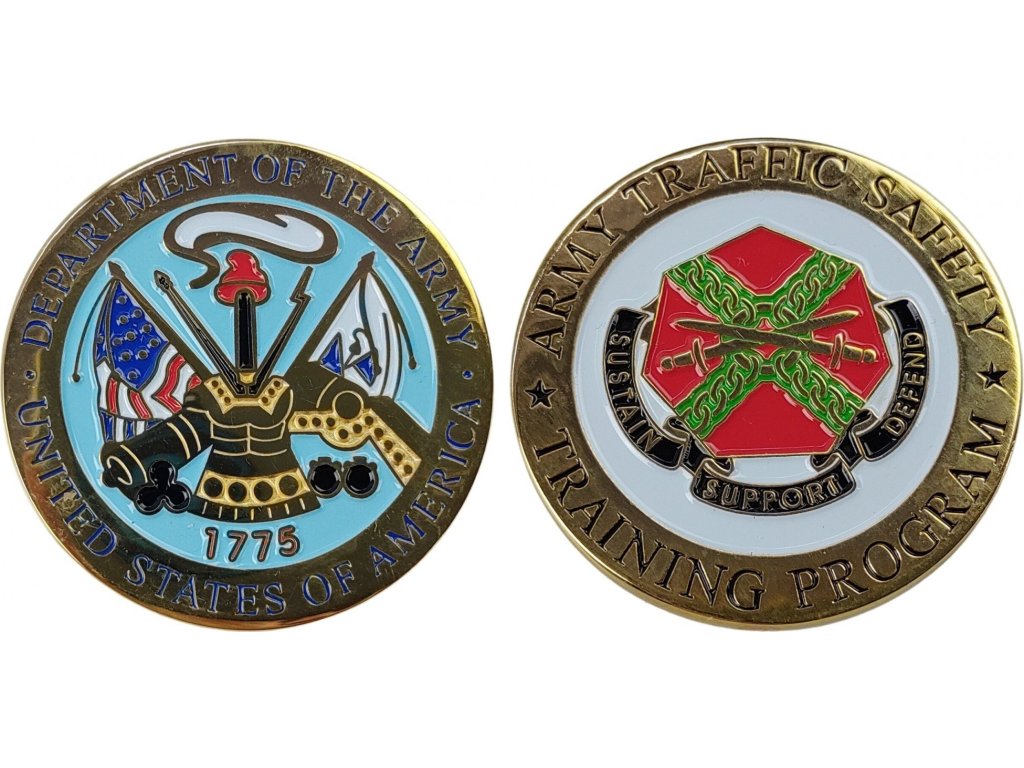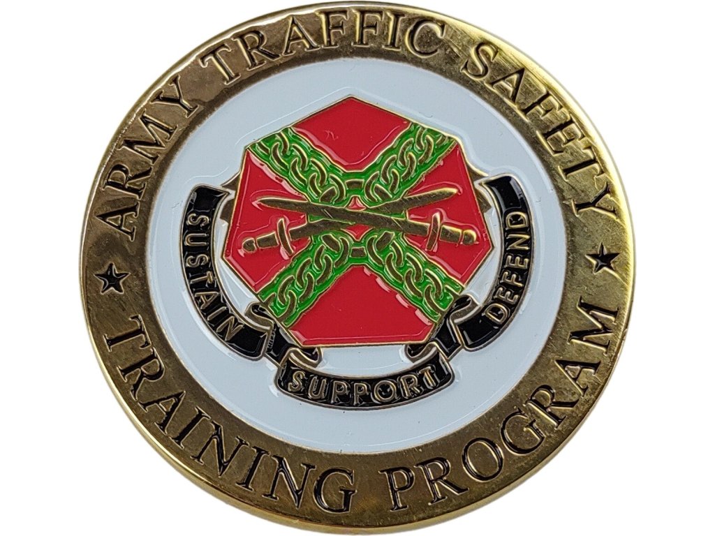 "Challenge Coin" (takzvaná výzvová minca) programu Army Traffic Safety Training Program (Program výcviku bezpečnosti cestnej premávky Armády Spojených štátov).