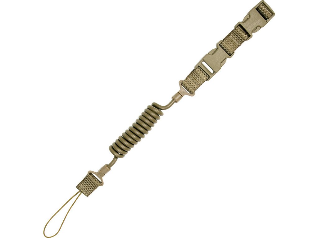 - Taktický zaťahovací pružinový popruh, bezpečnostný, ktorý chráni krátku zbraň proti strate.