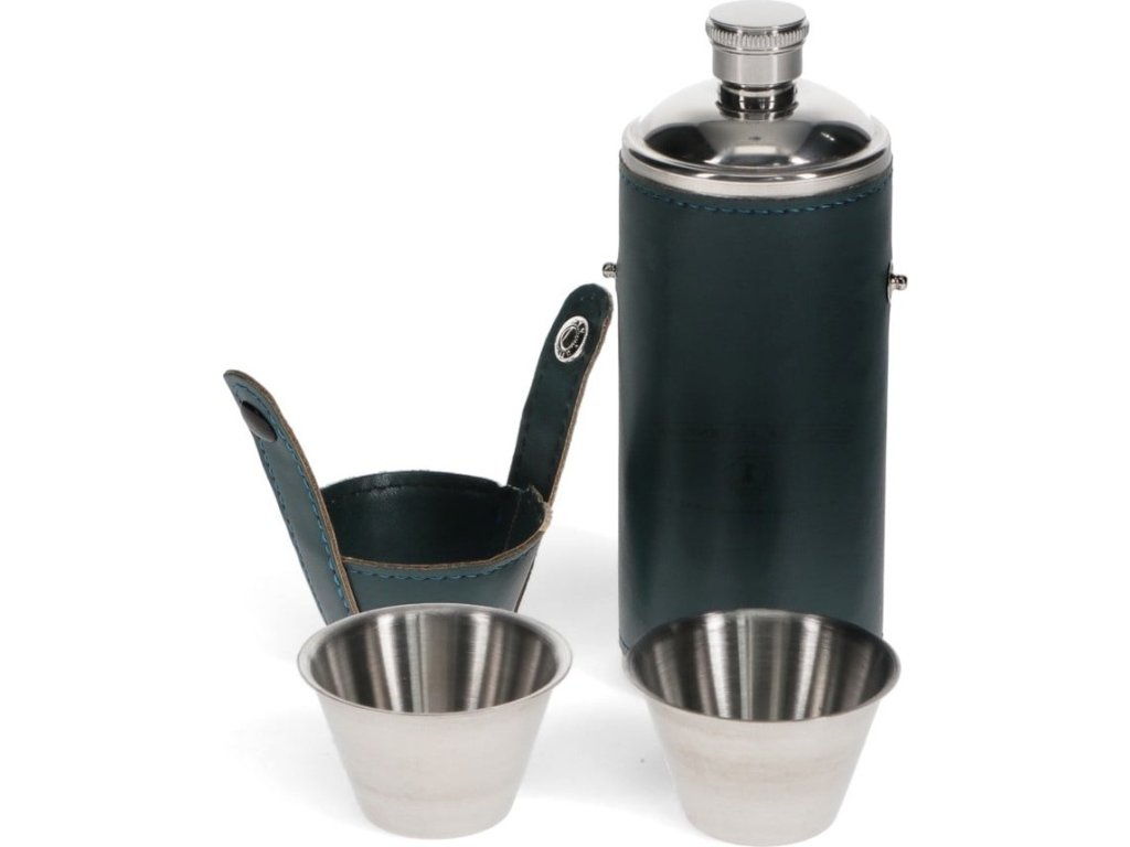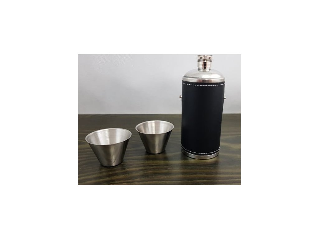 - Cestovná fľaša na alkohol s koženým krytom a 2 šálky.