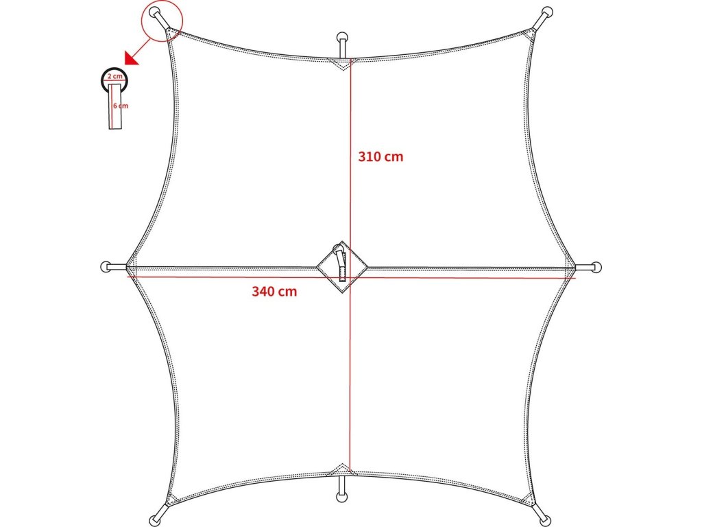- Celkom 9 slučiek s kovovými krúžkami po obvode, vrátane 8 kolíkov a 8 kotevných lán.