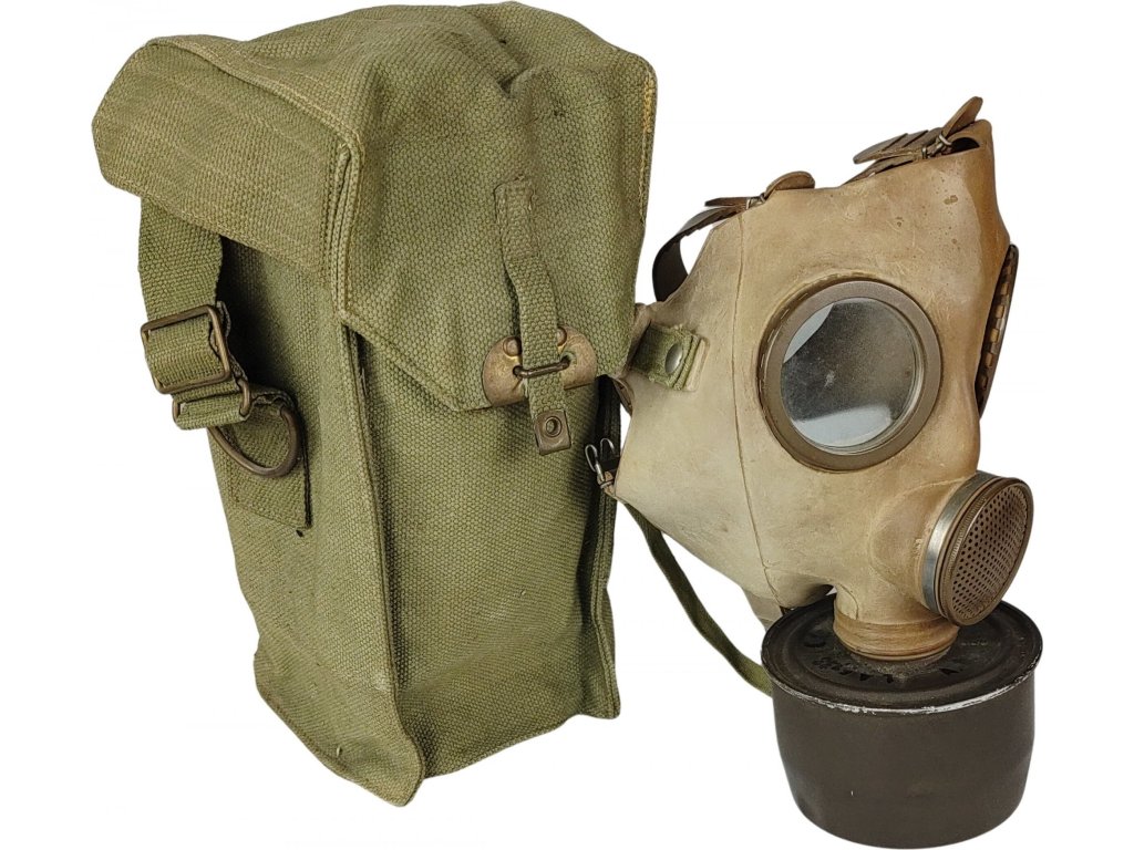Vojenská plynová maska francúzskeho výrobcu model ANP M51 s filtrom a taškou, ktorá bola pôvodne používaná belgickou armádou. Tašky boli vyrobené v 50. rokoch 20. storočia a slúžili až do 90. rokov.