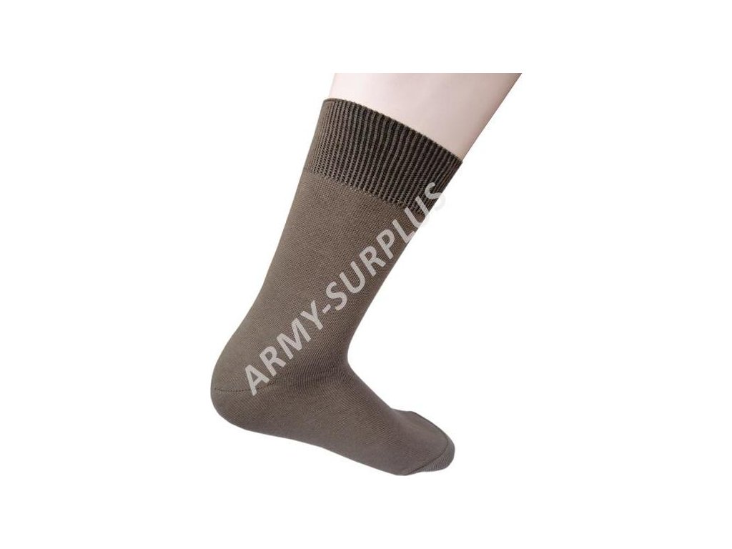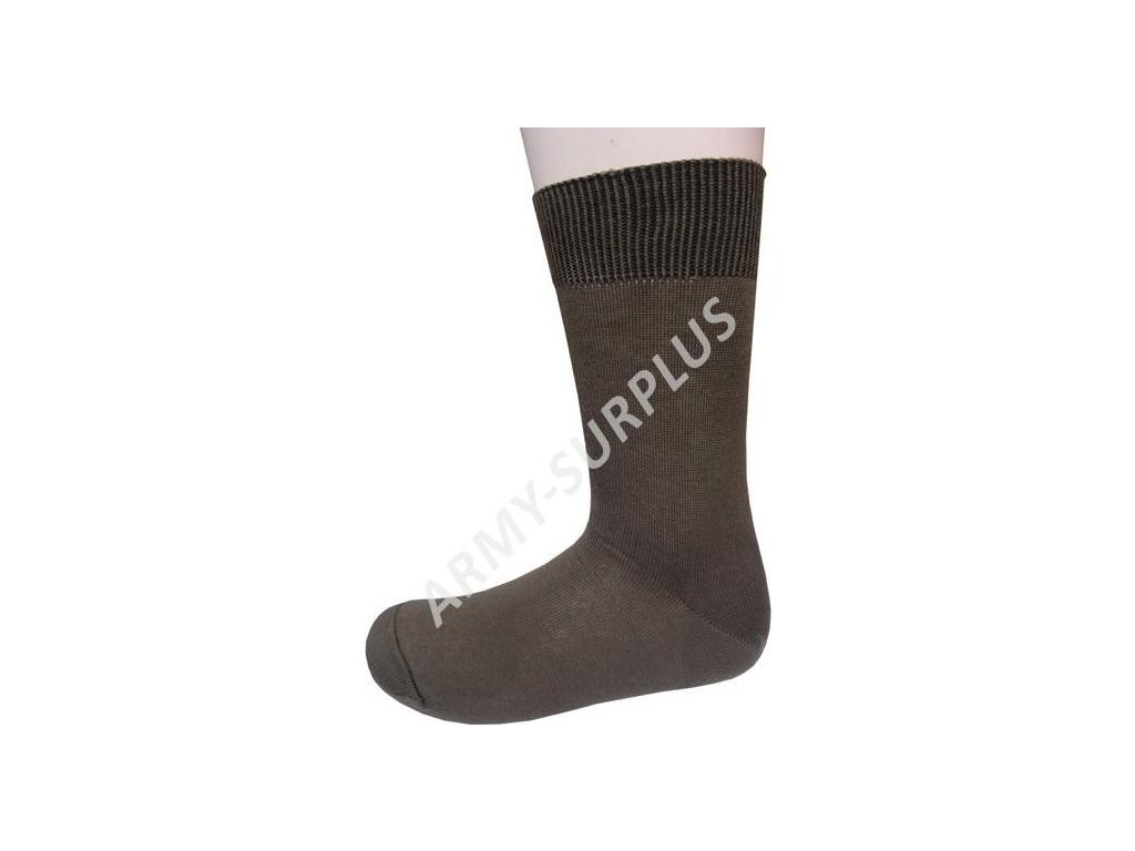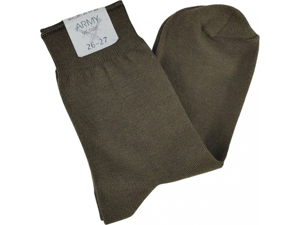 Pár ponožiek v khaki zelenej farbe hladkého vzoru, vyrobených prevažne z bavlny.