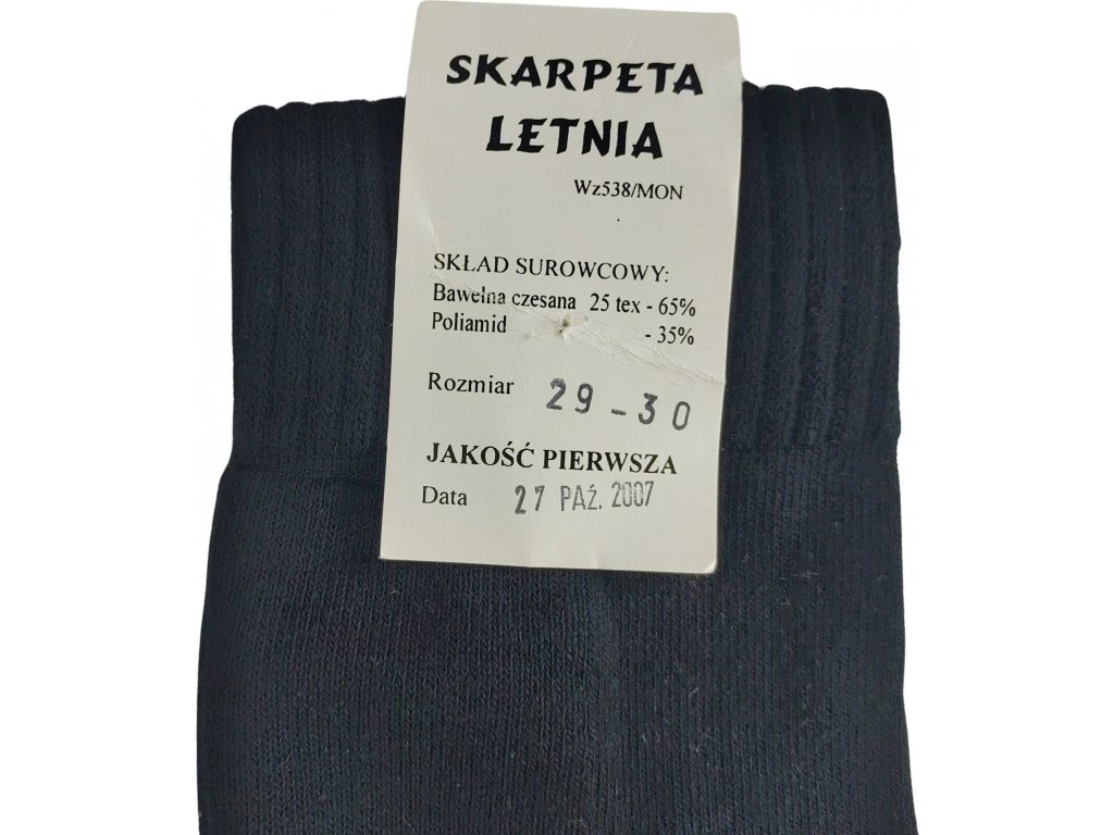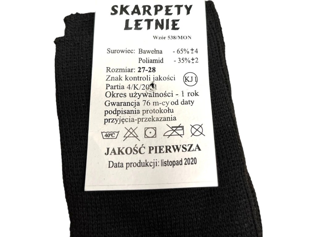 Letné čierne ponožky "SKARPETY LETNIE Wzór 538/MON" z vybavenia poľskej armády. Pohodlné a ideálne pre všetky typy vojenskej aj civilnej obuvi. Priemerná životnosť týchto ponožiek je približne 2 roky. Materiálové zloženie minimalizuje potenie nôh. Sú tenšie a pohodlnejšie v teplejších dňoch, vhodné na použitie, keď teploty neklesajú pod bod mrazu.
