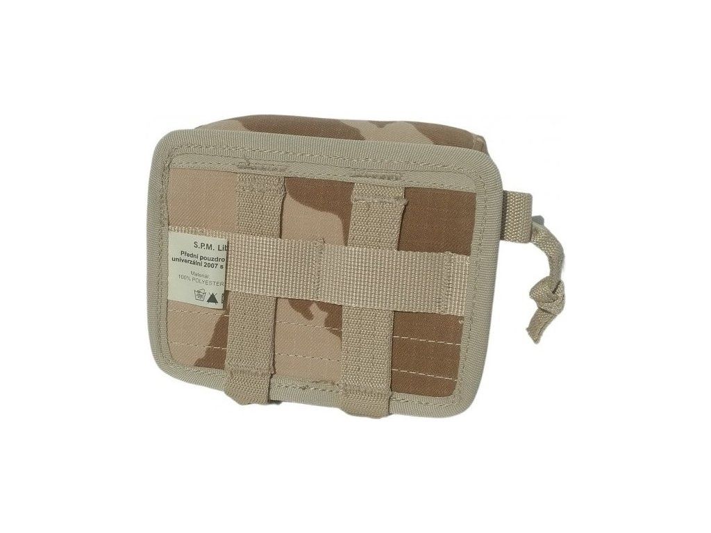 Originálne predné puzdro k univerzálnej taktickej veste model 2007, navrhnuté pre ľavú stranu vesty, vyrobené v SR firmou SPM-Liberec z vodoopudivého materiálu s nepremokavou úpravou. Veko tohto vrecka je zapínané kvalitným kosteným zipsom YKK. Upínací systém tvorí sústava prevliekajúcich pásikov, pomocou ktorých sa dá puzdro pripevniť takmer kamkoľvek. Toto taktické puzdro je uspôsobené na pripevnenie k univerzálnej nosnému systému UNI-2007 (obdoba MOLLE), alebo na NPP-2006 (Nosič pancierových plátov vzor 2006), alebo k predchodcovi systému MNS-2000 (Modulárny nosný systém vzor 2000).