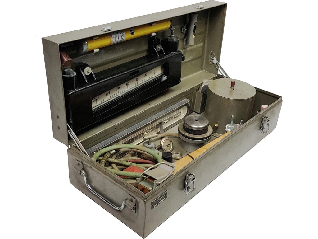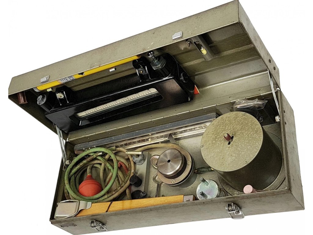 Vojenský prístroj na kontrolu a test plynových masiek v plechovom kufríku LWP Poľsko originál