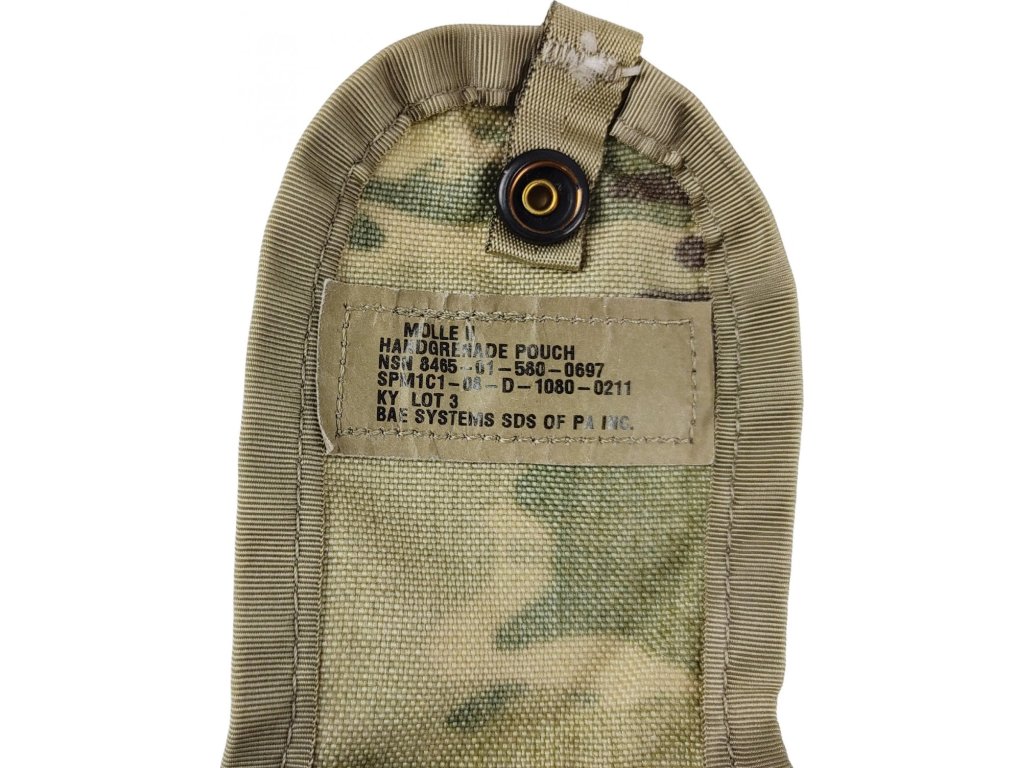Originálne americké taktické puzdro na ručný granát v univerzálnej kamufláži Operational Camouflage Pattern (OCP) MultiCam™. Puzdro obsahuje systém osobného upevnenia rebríka (Personal Attachment Ladder System – PALS), ktorý sa pripevňuje k modulárnemu ľahkému prepravnému vybaveniu (Modular Lightweight Load-carrying Equipment – MOLLE). Vyrobené v USA z prvotriednej nylonovej tkaniny s vysokou odolnosťou proti vode a oderu. Vyradené armádne prebytky, prevažne v nepoužitom a zachovalom stave.