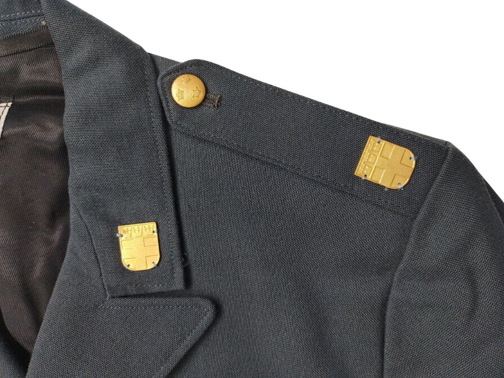 - Zapínanie v prednej časti na 5 zlatistých zdobených gombíkov (Ø 22 mm) s reliéfom štátneho znaku, symbolu Švédska - Tri koruny (švédsky: tre kronor).