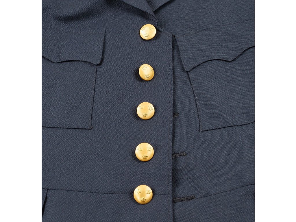 - Zapínanie v prednej časti na 5 zlatistých zdobených gombíkov (Ø 22 mm) s reliéfom štátneho znaku, symbolu Švédska - Tri koruny (švédsky: tre kronor).